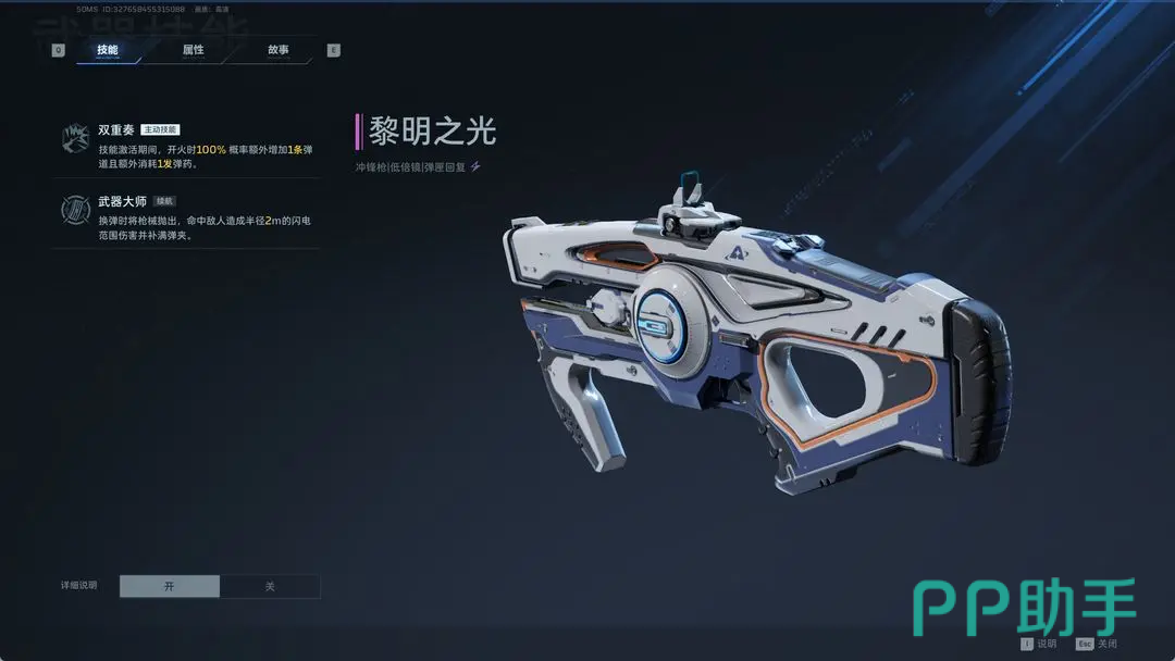 黎明之光:电弧元素属性冲锋枪,常作为主战武器配置。其主动技能“双重奏”可在持续时间内使每次开火额外生成一条独立弹道,触发概率为100%,但每发消耗2发弹药;被动技能“武器大师”则在换弹动作中将当前武器投掷出去,命中目标后造成半径2米的范围伤害,并立即补满当前弹匣容量。