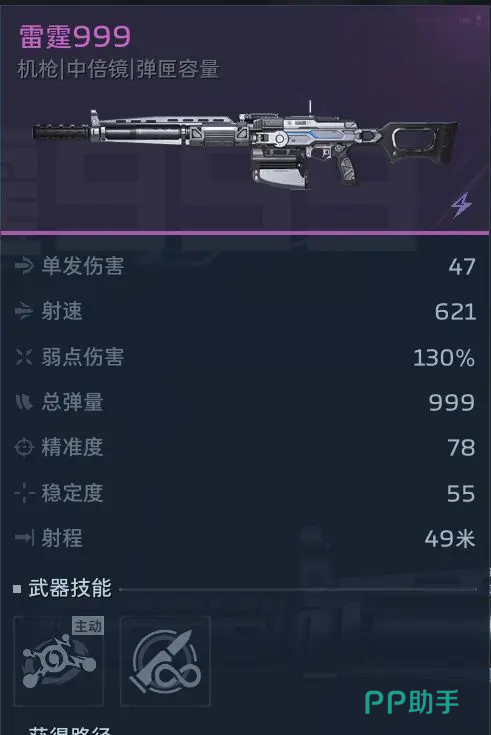 新手阶段最具性价比的非付费主武器为雷霆999,其副武器适配雷霆之影。该组合具备显著机制优势:主武器无需换弹,射速持续稳定,弹药基数充足,弱点部位伤害固定为130%;主动技能可触发电属性连锁伤害,即使未装配任何插件亦能形成有效压制。