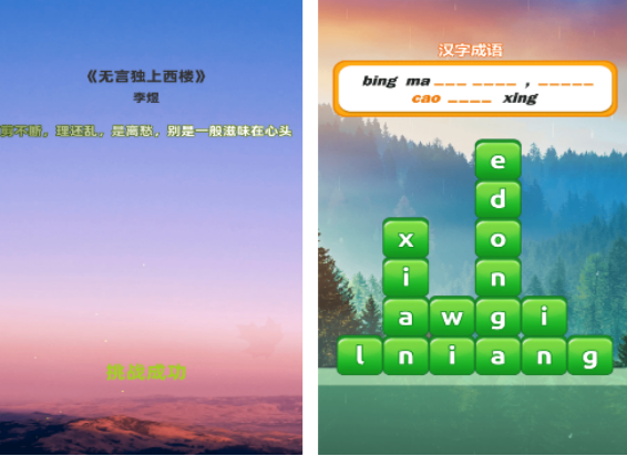 涵盖与拼音有关的各种知识,在儿童学习拼音的过程当中,可以利用游戏来加深记忆,玩法也是充满着趣味性,又有一定挑战性的。因为在每一个关卡当中,都会给大家显示出与我国古代息息相关的各种诗词歌赋,以及四字成语。需要利用显示出的拼音字母,正确连接的方式填入到适合的横线中,如果可以顺利拼写完成的情况下就能通关。