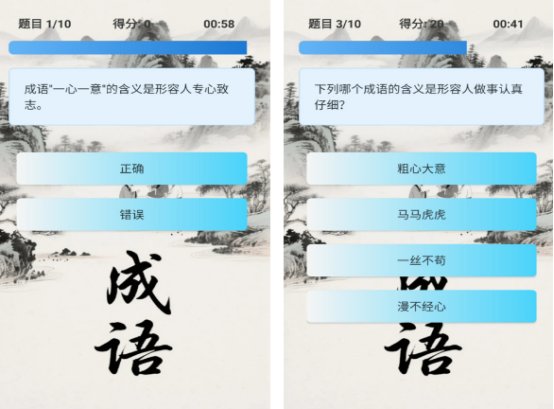 以成语答题玩法为主,有不同的难度等级,可以根据孩子的需求自由设计,在每个关卡当中都会显示与成语有关的知识,无论是根据文字提示,找出符合条件的四字成语,将不正确的进行排除。或者是对里面的成语进行相应的解释,利用正确判断题目正确或者是错误的这种方法,进行解答,都可以学到与成语有关的各种知识,要在规定的时间内将所有的问题回答正确,才能获得更高的分数。