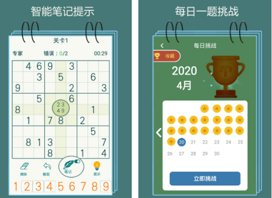 每个年龄段的人都可以通过这种游戏类型锻炼脑筋,考验逻辑思维水平。其中以九宫格为主的游戏,就是最为常见,只有在每一个方块当中填写一到九这样的数字是横竖列,每一个宫格当中,都不会有重复的数字,那么就可以完成相应的挑战。在难度上也可以自定义,每次挑战成功以后,还会显示答题的时间,挑战脑力极限。