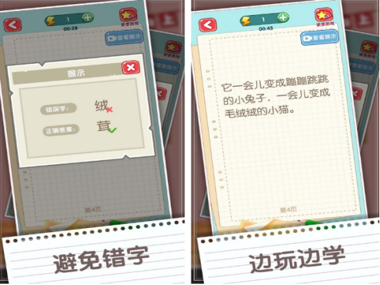 以寻找错别字为主要的玩法,对于孩子来说,既可以休闲娱乐,锻炼脑筋,还有超多与我国文字有关的各种知识,在显示出的一段文字当中,要仔细阅读每一个文字的含义,及时的找到错别字,就可以获得分数,通过关卡。还能够让孩子通过这一种方式避免在写各种文字的时候出现错别字,感受我国汉字文化的博大精深。