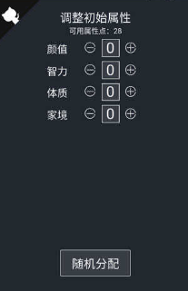 游戏模拟一个人从降生到离世的完整生命过程,开局的时候大家可以自己挑选角色天赋,还能把属性点分配到不同维度上,随后就能开启一段全新的虚拟人生。游戏里的所有发展都充满随机性,玩家能选不同的人生方向,还可以靠转动转盘来决定下一步走向。起始阶段得到的属性都是随机的,天赋和体质还有家境以及智力这些方面的数值都没有定数,玩家可以自由搭配这些属性。