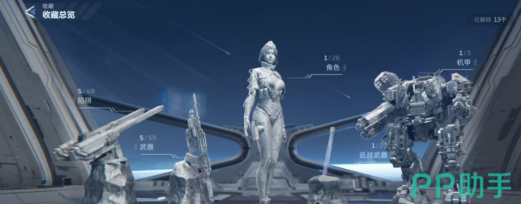 收藏功能入口位于游戏主界面大厅左下角,点击“收藏”按钮即可进入系统界面。页面中实时显示当前收藏等级、累计积分及已拥有物资明细,涵盖角色、主武器、陷阱装置、近战装备、机甲载具等多个分类模块。