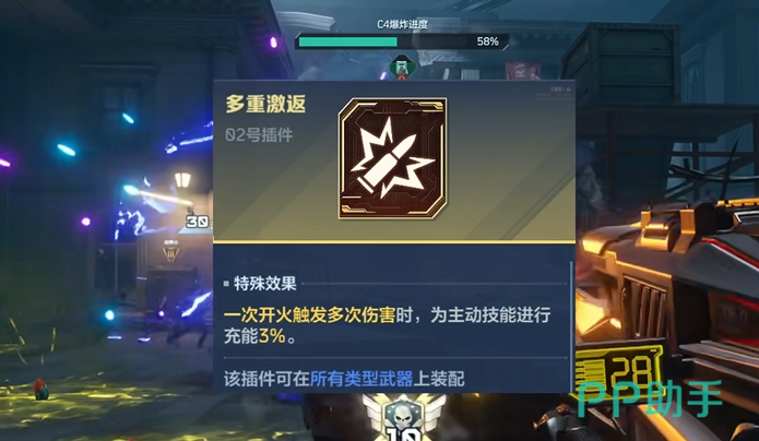 核心支撑插件为2号插件——多重激返。其机制为:单次射击可产生多次独立伤害判定,并同步为角色主动技能提供3%能量充能。该特性在面对密集敌人时尤为突出,大幅缩短狂热技能冷却间隔。若暂未获取该插件,可用扩容插件作为过渡方案,以保障基础弹药续航。