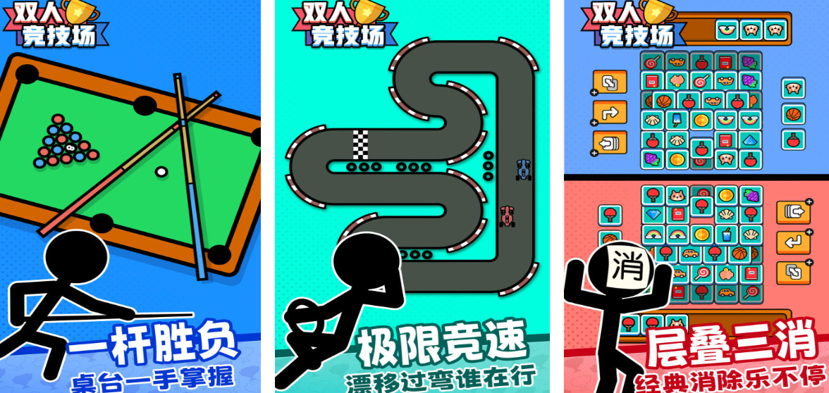《双人竞技场》游戏舍弃了繁杂的宏观战略,把其简化成几十个极具创意的小型竞技模块,从经典的指尖赛车到具有博弈色彩的乒乓对垒,全部支持双人同时在一台设备上进行实时对决。该作品的特点就是对触碰反应极为敏感并且物理规则不可预测,即便是简单的操作项目,也因为重力平衡或者反弹轨迹上的微小差别而出现出乎意料的反转。在有限的屏幕空间里建立公平的博弈秩序,在欢笑和博弈中增进情感纽带的设计,使竞技题材具有了更加生活化的亲和力。
