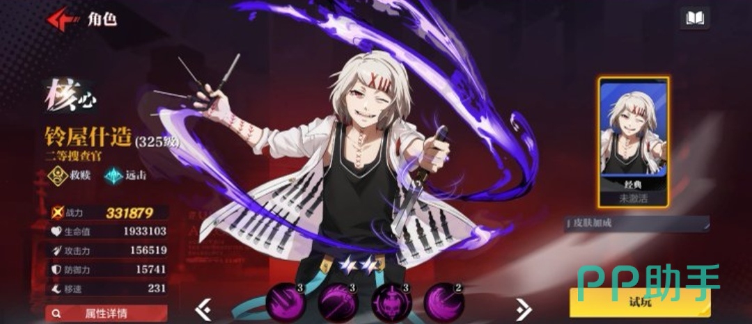第一位:金木研,来自不灭阵营的近战角色,擅长在近身战斗中进行持续高额的输出伤害,经常会打出暴击,他的技能【狂刃血宴】可以依靠尾赫包裹住身体化作血色风暴,来冲向敌方攻击力最高的单位,并产生一定的范围伤害,技能释放期间自身处于免控状态,此外,他的生命值越低,造成的伤害会越高。【碎空裂抓】这一技能在施展后,同样会用尾赫包裹自己,然后突袭到敌人身后,对沿途的敌人会造成极高的物理伤害,每命中一次敌人就会额外得到50点怒气值。【半赫者】可以增加自身的生命值与攻击力。