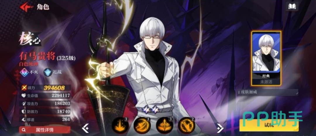 第三位:有马贵将,来自不灭阵营的近战角色,擅长近身缠斗,拥有高爆发以及强生存的能力。有马贵将的【终末裁决】在释放之后会闪身至敌人的身后,并造成一定的范围伤害,还有一定几率将自己的负面状态全部转移给随机敌人。【雷霆审判】这一技能施展后,有马贵将会使用IXA召唤落雷,对目标敌人以及周围的敌人造成两倍赫能伤害,每命中一个敌人就能回复自己一些自己的生命值。【不败传说】可以增加他的攻击力与生命值。