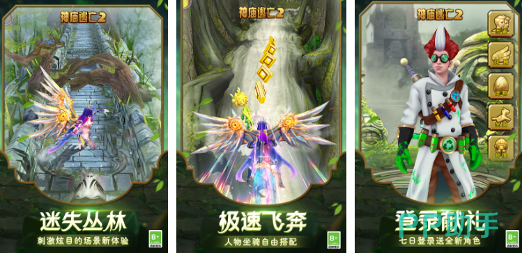 《神庙逃亡2》拥有跳跃、滑行和转向等多种技能,玩家可以控制角色在不同的主题,比如森林、矿山和悬崖中奔跑。游戏的核心故事性就是摆脱恶魔的追捕,所以兼具了休闲以及冒险。除了基础的人物角色以外,新手玩家登录7天后还会解锁全新的人物,如果还想要更多角色的话则可以使用获得的金币来购买。