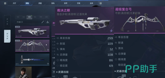 主武器可以选择裁决之眼,这把枪在机甲战中会拥有顶尖的表现,核心的优势全部都在技能上。主动技能在激活之后就可以迅速的提升暴击率,又或者是暴击伤害,让每一发子弹都拥有杀伤力。暴击命中之后还能解锁高额的攻击速度加成,这一整套技能组合下来,裁决之眼的输出能力就可以呈现出几何级的增长,面对厚重的机甲,也可以撕开防线。副武器方面可以选择超级复合弓,裁决之眼在开启主动技能之后就可以激活超级复合弓的技能,两者效果在叠加之后就可以提升更多的伤害。
