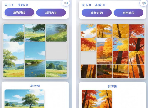 以熟悉的拼图闯关为主要的特色内容,适合各个年龄段的玩家,有现代的设计以及经典的玩法。在关卡的难度上也会不断的递增,搭配上好听的背景音乐以及流畅的动画,带来非常完美的体验。最初的时候由于难度较低,所以玩家在完成的过程当中会更为简单,通过参照图片以及移动碎片的方式,就有机会在特别少的步数当中完成挑战。