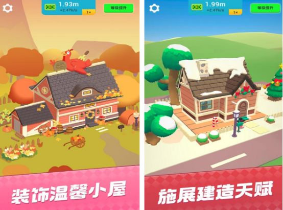 充满着休闲又有趣,一切可以从零开始,发挥你的创造力,就可以打造出自己喜欢风格的房屋,然后利用对内部的装饰,充满着可爱的样子。简洁明了的界面以及轻松上手的方法,可以让每一个玩家在这里面利用点击建造各种风格建筑物的方式,来享受炫酷的动画表现。完成任务得到的奖励以后,也可以进行等级提升。