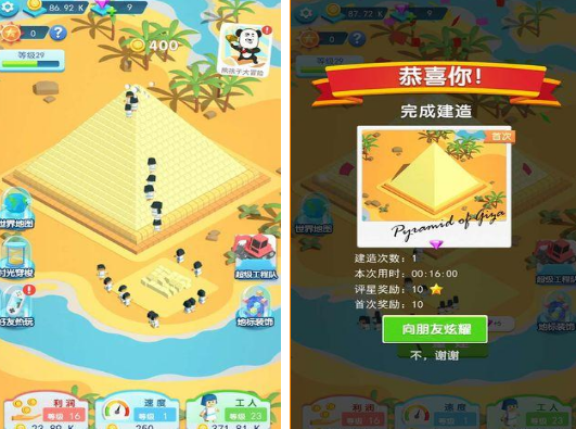 以专业的建造玩法为主,无论是你想要建造房屋,或者是在世界地图当中建造世界范围内备受好评的各种建筑物应有尽有,包括埃及金字塔这种在历史当中被称为奇迹的。还原了在建造过程当中所需要的超级工程队,无论是各种工程用车,都能够在建造的过程当中起到非常重要的作用,让玩家每次完成任务获得丰厚的奖励。