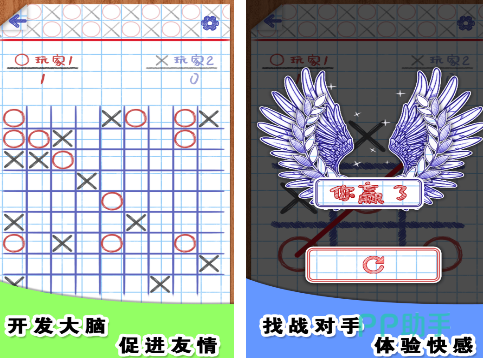 作为以经典的井字棋玩法为主的手游,既可以通过双人pk的方式进行较量,还支持人机对战模式。主要的特点就是两个玩家轮流下棋,分别代表的是o和x,只有在下棋的过程当中,能够使自己所代表的棋子有三个相同的连在一条线,就能够完成任务,取得胜利,考验玩家的脑筋,操作方式也是很简单的。其中的人机对战模式提供了三种不同的难度。