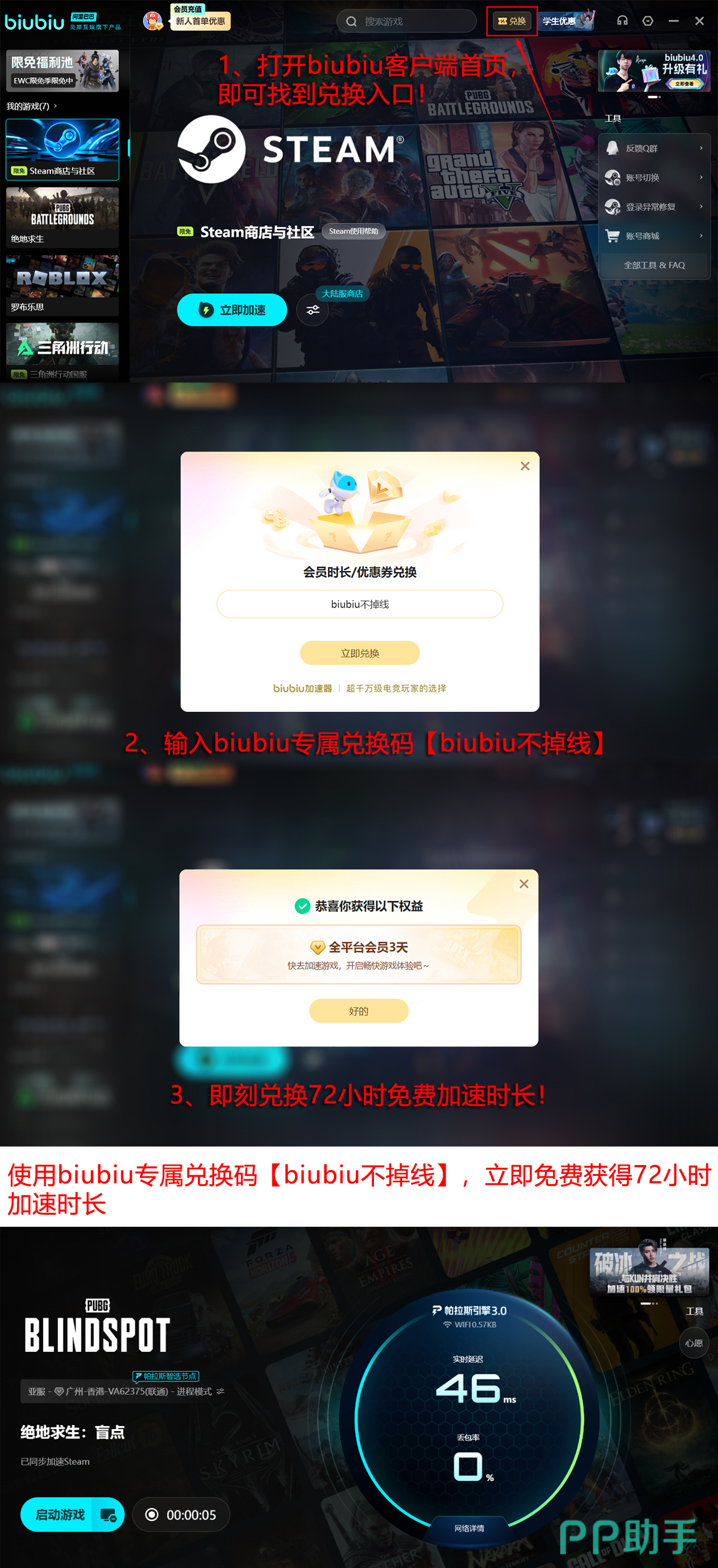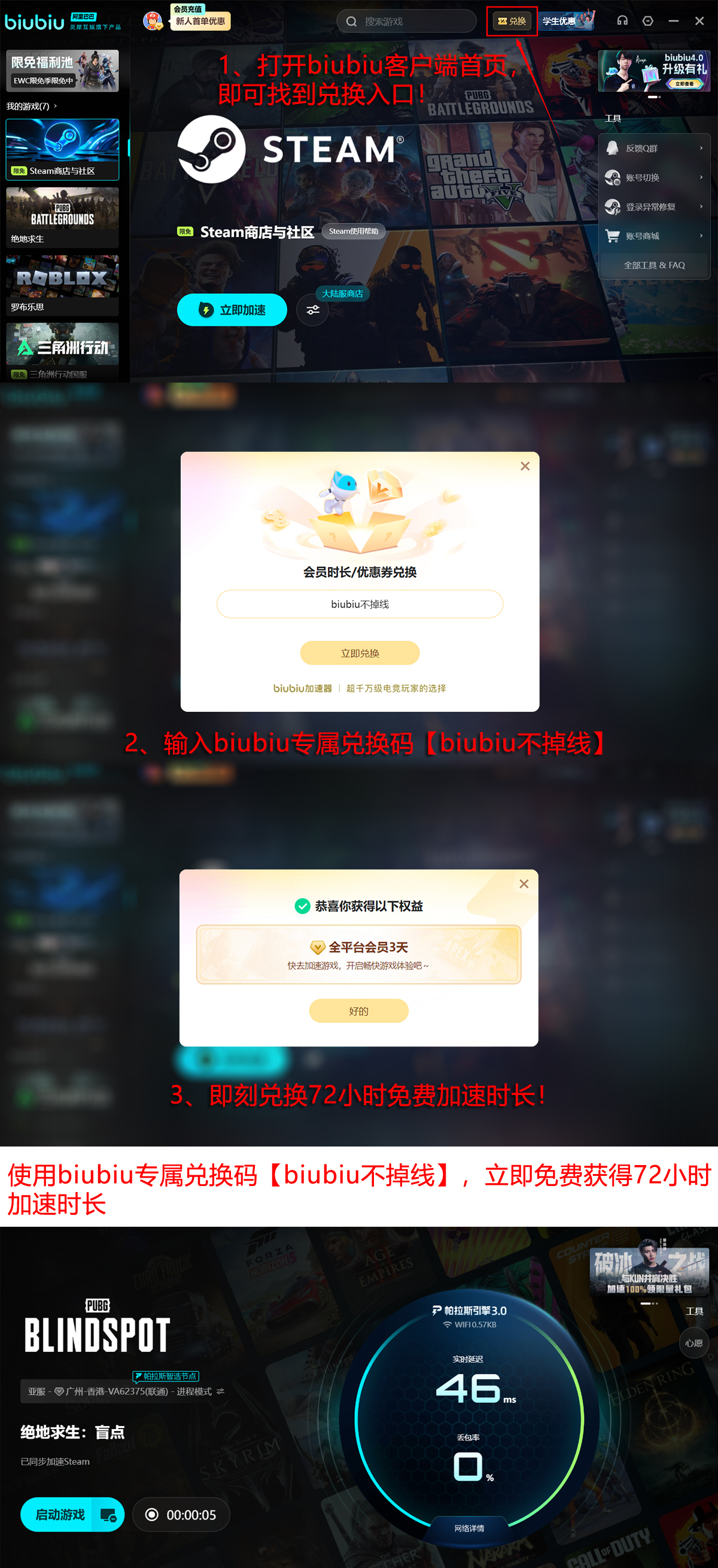 新用户注册即享全功能试用权益:激活后立即获得24小时无限制加速服务;完成指定动作后输入兑换码【biubiu不掉线】,额外延长72小时服务周期。综合计算,首次使用用户可在测试阶段累计享受长达96小时的免费加速支持,全程覆盖测试启动至收官阶段。