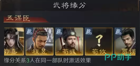 缘分系统方面,“五谋臣”组合(郭嘉、程昱、荀彧、荀攸)可激活专属羁绊。当其中任意三人同编一队时,所有缘分武将获得5%“看破”属性提升,并降低4%所受伤害。该效果在对抗高命中、高暴击队伍时尤为关键,是提升整体生存韧性的底层增益。