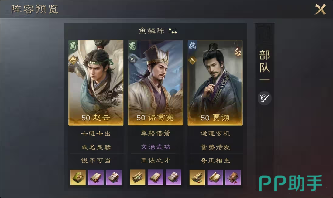 配队推荐以赵云、诸葛亮为核心形成魏蜀混搭体系:赵云提供高爆发与突击稳定性,诸葛亮强化智力联动与战法覆盖率,贾诩则承担节奏调控与容错兜底职能。兵种进阶方向锁定弓兵专精,优先选择“袍泽同心”兵种特性——当贾诩为友军施加治疗时,有60%概率额外触发一次兵力回复,大幅增强持续作战能力。