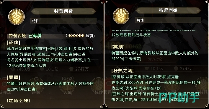 其核心增益技能「冲击力损伤增幅」存在多重叠加条件:当特蕾西娅施放冥顽属性技能,且队伍整体正面命中目标时,除基础生命值提升20%外,每提升1星(最高升至11星),该增幅效果将阶梯式强化。具体表现为:骑士在场或狂热之魂存续期间,冲击伤害加成区间为40%至200%;升至9星时上限提升至400%。该增幅数值严格绑定角色自身特性及实时战场状态,不可脱离条件单独生效。