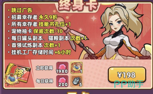 重氪玩家除完成首充及上述礼包外,应重点布局周期性权益——周卡、月卡与终身卡。其中,周卡提升钞票掉落上限与获取速度,并使挂机收益增加10%;月卡免除广告干扰,每日在常驻卡池享有1次自选机会,同时开放3倍速战斗快进及经验加速上限扩容;终身卡提供永久广告跳过权限,幸存者招募享9折优惠,宠物抽卡保底次数减少10次,且所有幸存者技能书额外增加1个孔位。