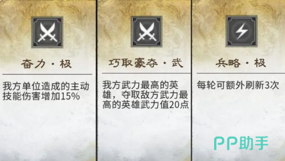 初始效果建议优先锁定三项:提供15%主动技能伤害加成的“奋力·极”、可夺取敌方高武力武将20点武力值以提升容错率的“豪夺·武”,以及赋予每轮额外3次刷新权限的“兵略·极”。三者协同作用,显著增强阵容构筑灵活性与战斗稳定性。