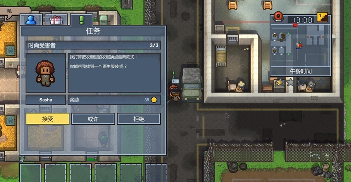 合成完后,可以去餐厅下层待会儿,之后找其他犯人接一个名为时尚受害者的任务,该任务可获得医生服装,若是在一开始找不到这个任务,可以反复进行刷新,在点名时候进行刷新,更容易能找到,获得医生服装后,找一个不起眼的地方换上,之后便是前往医务室,进去后就在工作台中翻找,便能得到医务室服装,穿上医务室服装后再出去,出去会有一个违禁品检查,所以建议事先要做一个违禁品袋,以防万一。最后,便是穿着医务室服装到医院上方的担架互动即可逃脱了。