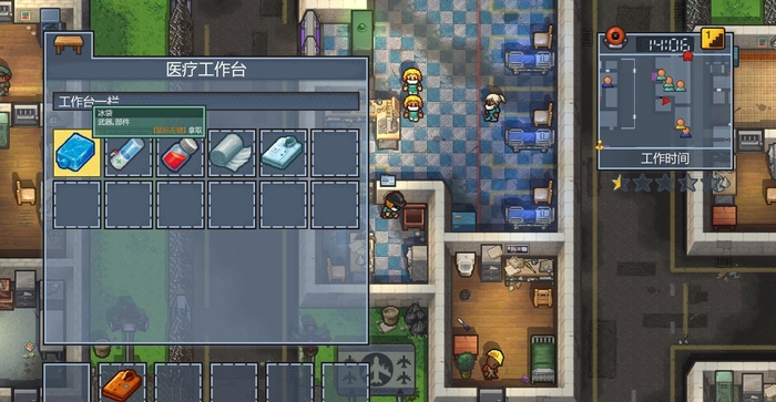 接下来,小编就讲下逃跑的流程:在玩家出生后,便要立刻搜索其它房间,因为第一天获得冰袋的几率是最大,其中所需的一个冰袋在医院的隔间里,可以穿医疗服进去拿。另一个冰袋散落在外面的箱子中,一个个去翻找就行了,在此过程中顺手搜一个胶带,然后便可合成减缓器,合成心率减缓器是需要50点智力。