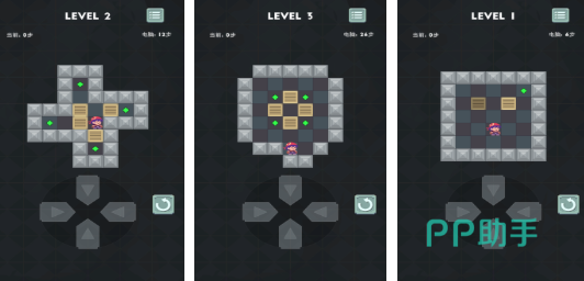 基于Sokoban经典谜题框架深度开发,共设1200+原创关卡,按难度线性递进:前100关侧重基础移动逻辑训练,300关后引入传送门、冰面、压力开关等复合机关。角色控制完全依赖四向方向键,支持撤销步数、重置当前关卡、查看通关提示三项辅助功能。所有地图均通过人工校验,确保每关存在唯一最优解。虚拟按键区域适配主流屏幕尺寸,点击反馈明确,长时间游玩不易误触。