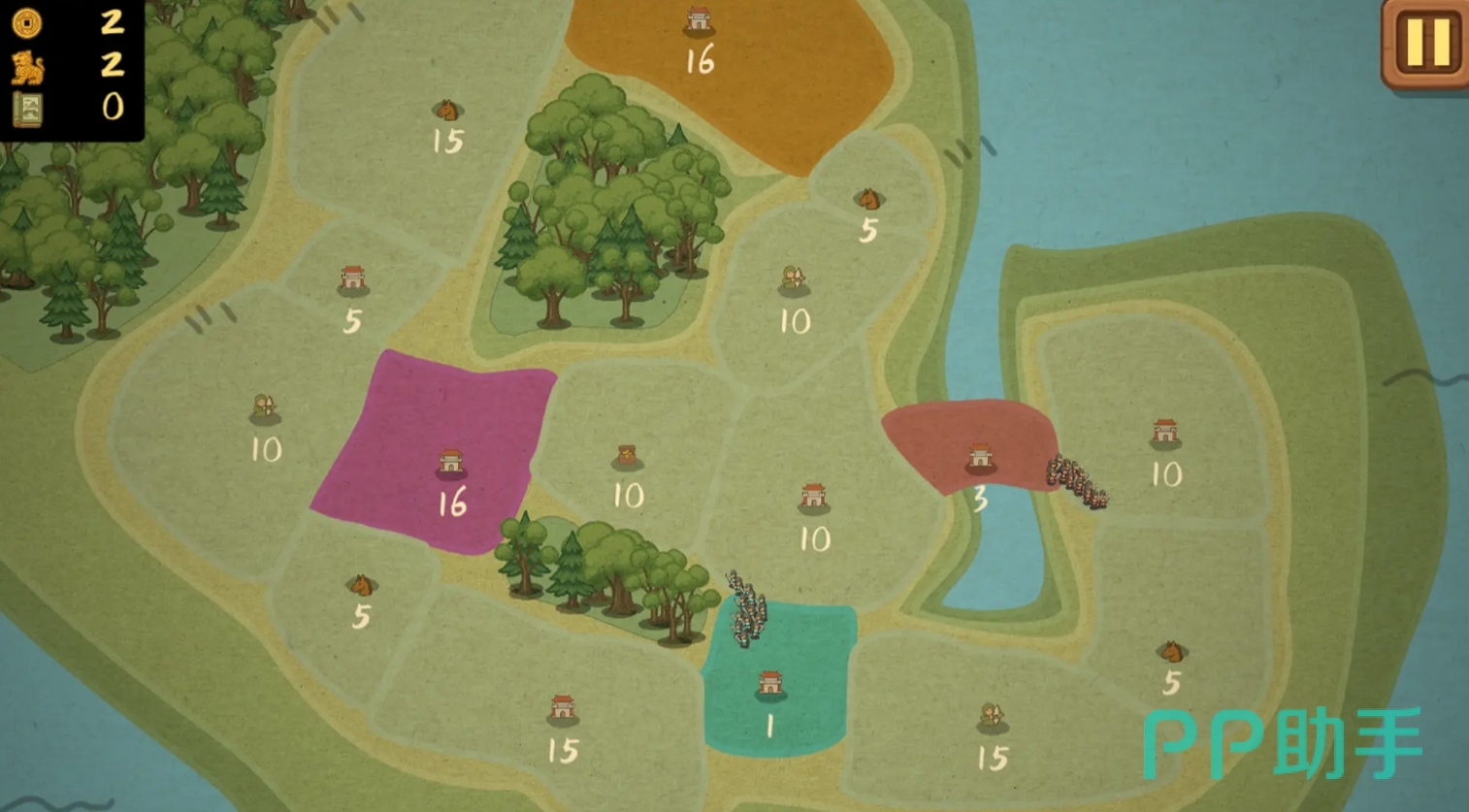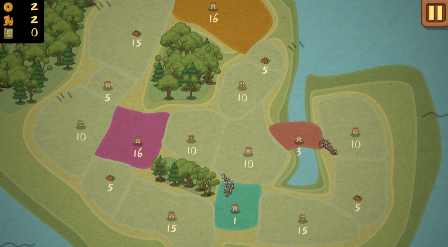 每位玩家都能在《占山为王2》中获得一座初始城市,并且城池里的士兵数量会随时间上涨,只要各位将他们派往其它的城池,打败城池的守军,便能完成城池的占领,让城池所在地块归属于自己的麾下。士兵们作战时会根据双方的数量来决定胜负关系,只要自己派出的士兵足够多,必定能完成占领,但也要谨防自己后方出现防守空虚的情况,不要给敌人任何可乘之机占领己方城市。