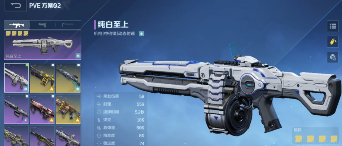 还有一把比较特殊的武器叫纯白至上,功能性比较强。新手进游戏就能领取,最大的优点是弹夹容量大,续航能力强。升级之后,会解锁暴击回血的被动技能,释放战术立场,还能给队友增加暴击率。如果你经常组队打副本,哪怕自己输出不是特别高,靠着这个群体增益效果,也能稳定拿到奖励。而且插件系统支持跨武器复用,后期换装备的时候,之前所投入的资源也不会浪费掉。