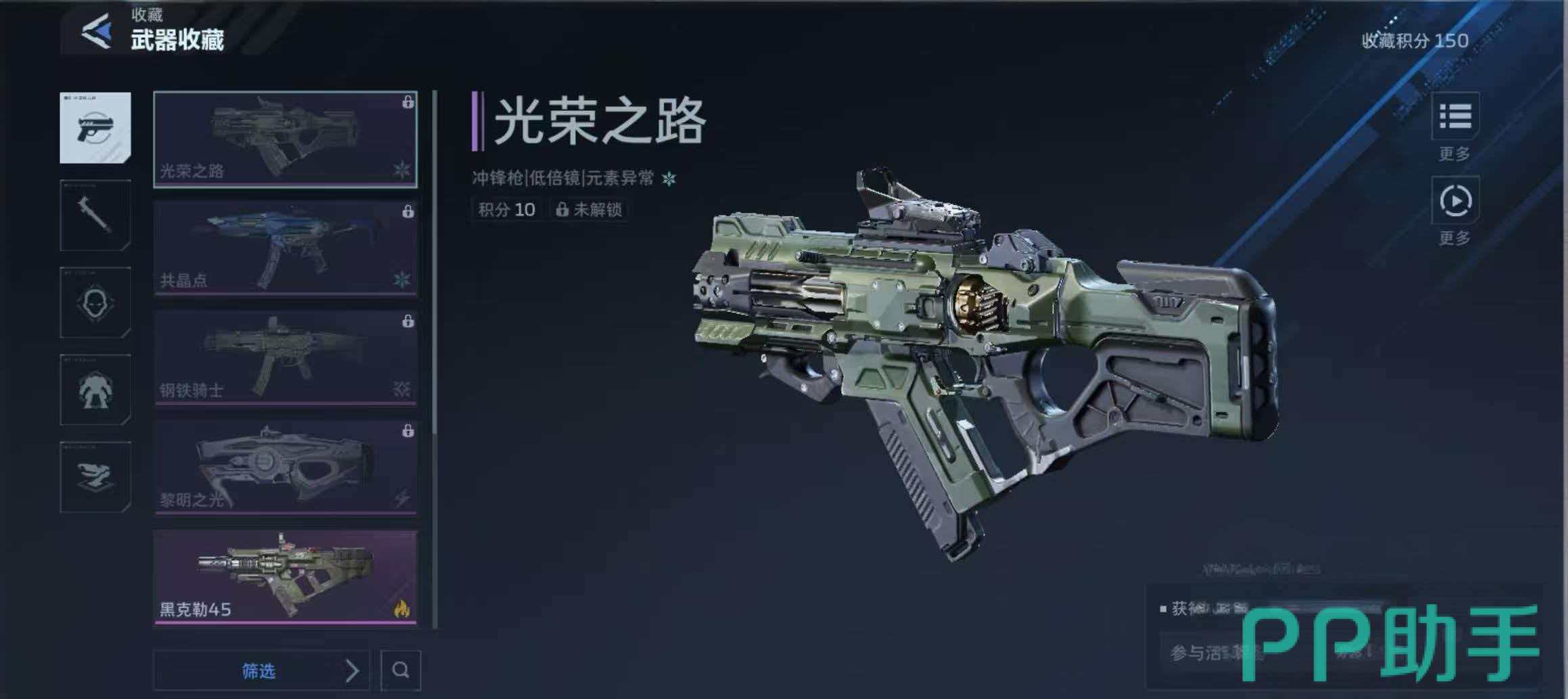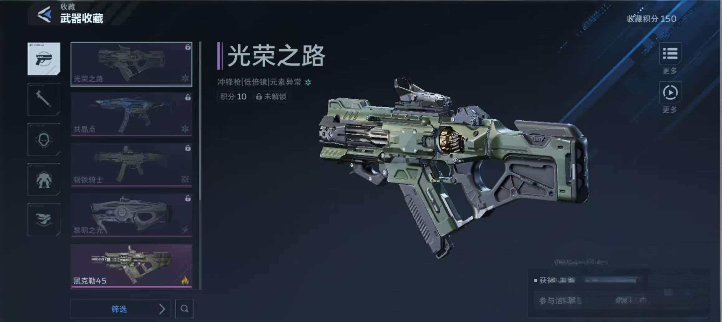 当前游戏一共给玩家们提供5款冲锋枪,分别是钢铁骑士、共晶点野草、黑克勒45、光荣之路、黎明之光等等,这五款冲锋枪还非常贴心的设计出了对应的皮肤哦,比如说黑克勒45的皮肤星蓝破晓等等,这些武器在获取途径上有些一样,也有些完全不同。