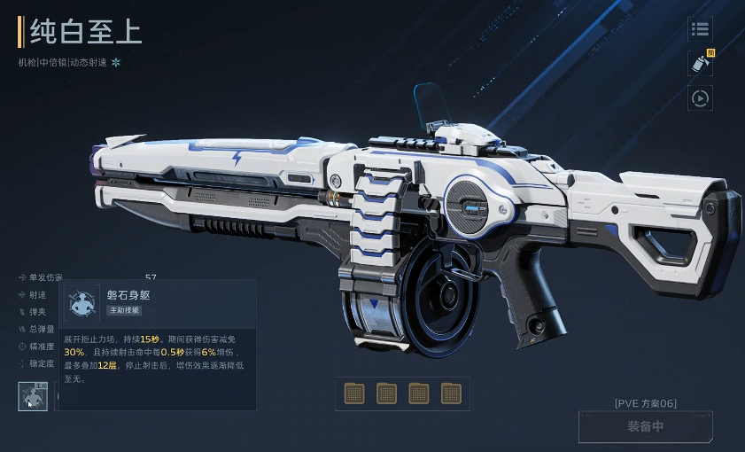 第三个为大家推荐的就是纯白至上,纯白至上当前的武器面板其实除了换弹的劣势比较明显以外,其他的数值都还很不错,它在配件效果上面如果有这类效果可以提升,就可以避免换弹的次数太多,其实它用来当做大家的主要核心武器也是不错的,不过大家开箱子的概率上面没有雷霆999就有那么高,在这里的话,纯白至上利用自己的技能效果可以展开一个力场,力场在生效时间之内,角色获得的各种伤害都会减少28%的数值,而且它在持续输出的时候,可以让自己的射击命中率达到8%的提升,2级的时候有96%的提升,另外在使用成本之上武器停止射击之后,这里的增长效果是会慢慢降低,而不是一时间直接降为零,所以在后期持续射击能力上面也非常好用。