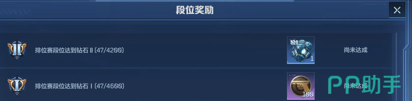 钻石段位进一步强化随机奖励价值。从钻石五晋升至钻石二,每提升一个小段位均可获得1个钛金跃迁秘藏宝箱,内含传说或史诗品质武器,包含限时与永久两种类型;抵达钻石一后,额外授予50荣誉点。