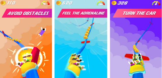 关卡制设计,共设数十个难度递进的挑战场景。整体美术风格明快清新,色彩饱和度高,视觉辨识度强。游玩时通过左右滑动屏幕控制过山车横向位移,规避障碍的同时收集散落金币,目标是刷新个人最高得分纪录。