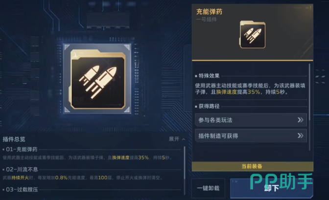 区别于依赖固定属性的传统枪械体系,《逆战:未来》强调“人装协同”。面对快节奏交火、高密度掩体或长距离拉锯等多样化战场环境,仅靠更换主武器难以兼顾所有需求。此时插件便成为关键变量:每个插件具备唯一效果标签与明确触发逻辑,支持即插即用、随时切换。其中,“充能弹药”是泛用性最强的基础型插件——适配全枪械类型,获取门槛低,且具备双重增益:在角色触发主动技能或特定战术动作时,自动完成弹匣填充,并同步提升换弹速度35%,持续时间达5秒。这意味着技能释放与火力续航形成闭环,彻底规避传统换弹空档期。