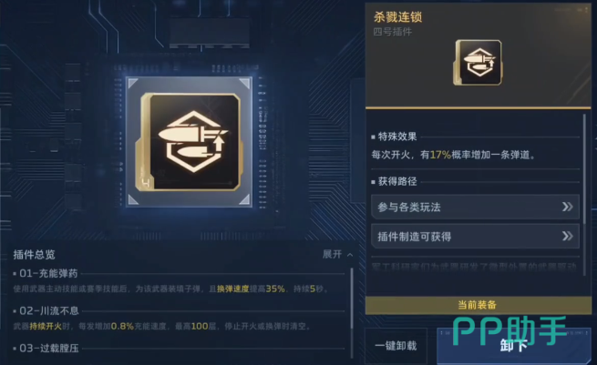 针对高强度近战压制场景,推荐选用“杀戮连锁”插件。该插件无枪械绑定限制,掉落来源广泛,核心机制为:每次射击均有概率额外生成一条独立弹道,显著提升单次开火的命中容错率与区域覆盖能力。而若侧重持续火力压制,则“川流不息”为更优解——其不增加弹药量或弹道数量,专注提升武器充能效率。装配于突击步枪或机枪后,只要保持连续射击状态,即可累积充能层数,最高可达100层,每层提供0.8点充能值,直接缩短技能冷却周期,强化节奏掌控力。