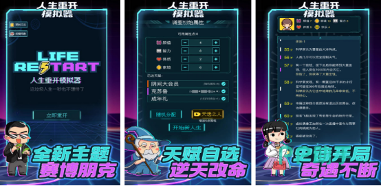 延续原版端游的核心特性,以独特的文字冒险为题材,融合了很多奇思妙想,通过分配属性,选择天赋来体验不同的人生轨迹。当前新增修仙成佛、阴阳双修等不同的特色分支剧情,让所有玩家都能体验无比精彩的人生,有足够精妙的游戏文案,折射出对生活的思考,甚至也有大量非常大胆爱,充满想象的特色元素,增强娱乐性和代入感。