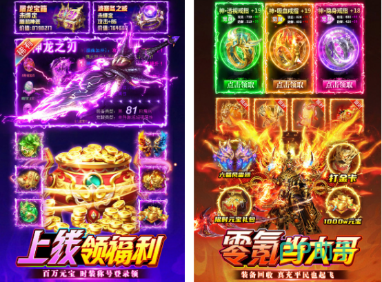 这是高攻速打金,以及热血高回收的传奇手游,不仅能够让很多的散人感受游戏爽快的战斗,除此之外,也能够满足土豪,或者想要与兄弟共同玩游戏的需求。在成为了里面的角色以后,能畅玩全部的地图,没有任何的任务,反而可以在这一款游戏当中加入快节奏,以及自由的pk或者是跨服征战等,融入了超多经典的玩法,以及创新的元素。