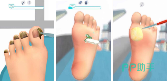 极其简单的操作方式,提供各种修脚的道具,比如有指甲刀或者是棉签等等,嗯这些修脚道具都可以免费使用,利用手指点击屏幕就可以完成一系列的任务要求。当顾客的脚部出现各种脓包或者是出现裂伤时,也可以对其进行清洁,之后就要涂抹药膏。