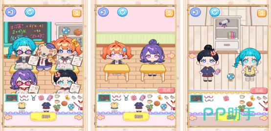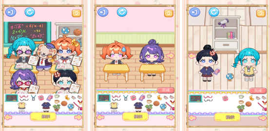 本作以校园日常为叙事主线,融合解压与治愈双重体验。通过贴纸化交互设计呈现多样化服饰、剧情片段及场景元素,完整覆盖教室、寝室、走廊等典型空间。每页独立构成一个生活切片,例如课堂场景中可拖动粉笔、整理课桌、擦净黑板;用户通过点击或滑动完成轻量化任务,在低操作门槛下获得沉浸式青春氛围感。
