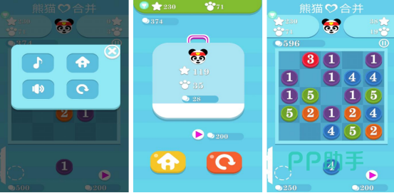 本作采用数字合成机制,规则清晰直观:初始界面呈现若干带数字标识的熊猫图标(如1、5等),玩家通过滑动操作将相同数值的熊猫两两归并,实现1+1=2、2+2=4的递进式融合。每关设定明确目标分数,需在限定步数或时间内达成,考验逻辑预判与空间规划能力。