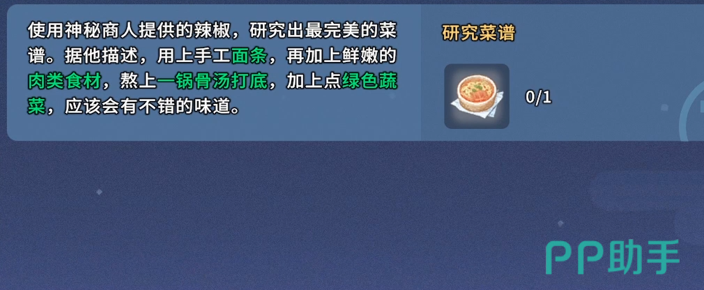 小面并非初始开放菜式,其食谱需通过特定任务解锁。该食谱不位于常规烹饪手册中,而是作为隐藏内容嵌入于中期主线关联的支线任务内,具有唯一获取路径。