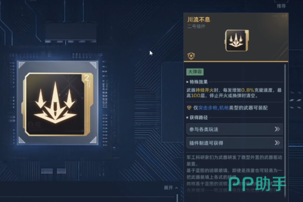 针对刚接触游戏的新手用户,推荐优先装配【充能弹药】插件。该词条效果为:在主动技能激活期间,子弹装填速度提升30%。这一机制有效缓解新手因操作生疏导致的频繁换弹卡顿问题,大幅提升连贯作战体验。若仍希望进一步压缩换弹间隔,可叠加【川流不息】插件——其触发条件为持续射击,每完成一次命中即可加快充能进度,最终实现更短的弹匣重置时间。需注意:【川流不息】仅对突击步枪与机枪生效,其他类型武器无法触发该效果。