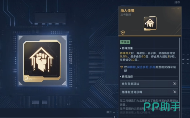 追求高爆发与持续压制力的玩家,可重点考虑【渐入佳境】插件。该词条支持最多60层伤害叠加,每次命中目标均可增加1层,且每层提供固定比例的伤害加成。但存在严格衰减机制:一旦中断射击超过1秒,将每秒自动清除10层。因此,该插件高度依赖稳定输出环境,仅推荐搭配机枪、突击步枪及冲锋枪使用;霰弹枪、狙击步枪等非持续射击类武器装配后无实际增益。