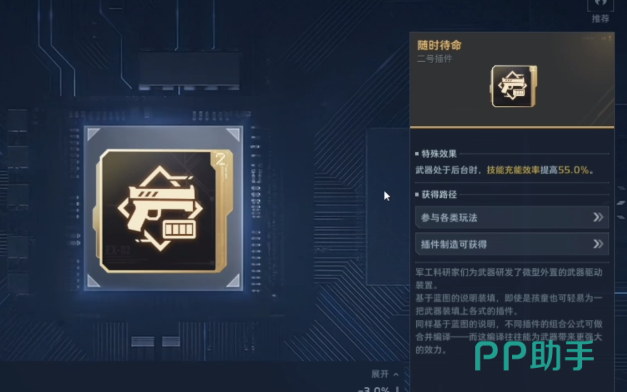 兼顾多武器切换策略的玩家,建议选用【随时待命】插件。当当前武器处于非激活状态(即后台携带)时,其主动技能的充能效率提升55%,且完全不影响主武器的攻击速度或后坐力表现。该词条特别适配双持配置场景——例如以突击步枪为主武器、手枪或霰弹枪为副武器的组合,在快速切换过程中仍能维持技能响应节奏,避免关键技能空档期。