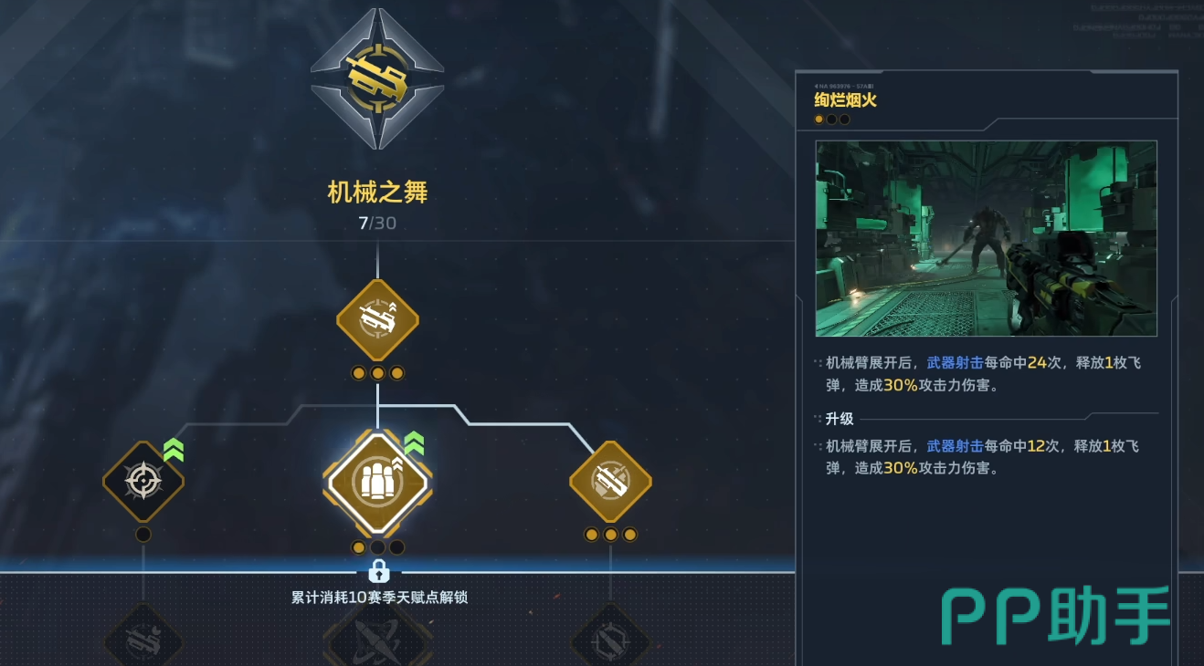 “机械之舞”路线则围绕单体穿透与节奏化打击构建,关键天赋如“绚烂烟火”要求命中24次后触发飞弹攻击,提供额外单体伤害;“死神时刻”设定为每攻击敌人8次即发射一枚追踪导弹,形成稳定且可预期的持续伤害链。此类天赋不依赖瞬时爆发,而是通过高频命中积累效果,特别契合需要精准压制、长线消耗的Boss战环境。加点时应优先解锁基础命中加成、攻击频率提升及导弹伤害增幅模块,确保技能循环顺畅、输出无断档。