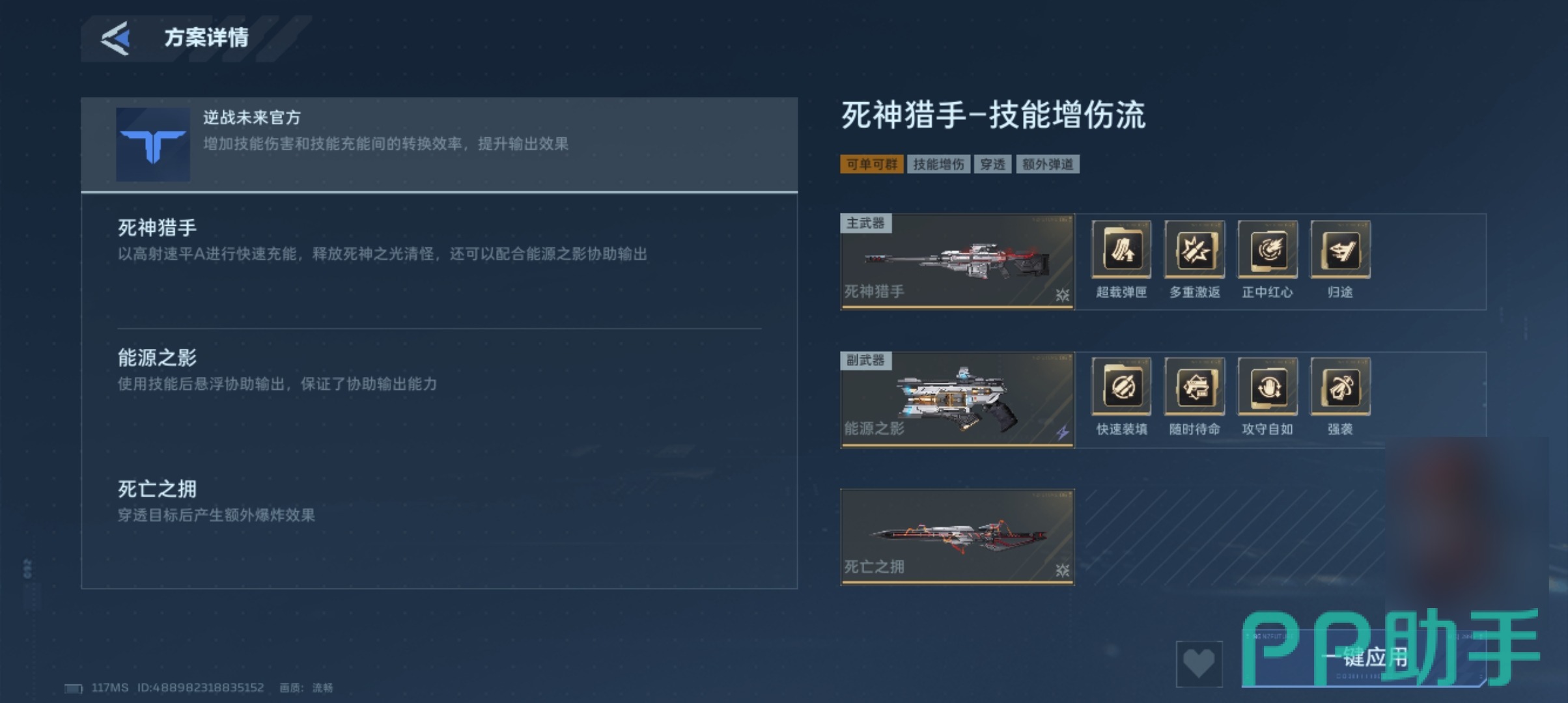 具体到“能源之影”的四槽装配策略: 1号槽推荐装配【快速填装】,显著压缩换弹时间,直接提升被动技能的触发频率; 2号槽选择【随时待命】,加快能量积攒速度,保障主动技能的持续可用性; 3号槽优先【攻守自如】,被动触发时提供30%伤害增幅,并同步激活20秒减伤效果,大幅提升生存容错; 4号槽锁定【强袭】,使主动技能在释放过程中有概率追加一道穿透型激光,最多可同时命中4名敌人,强化群体压制能力。
