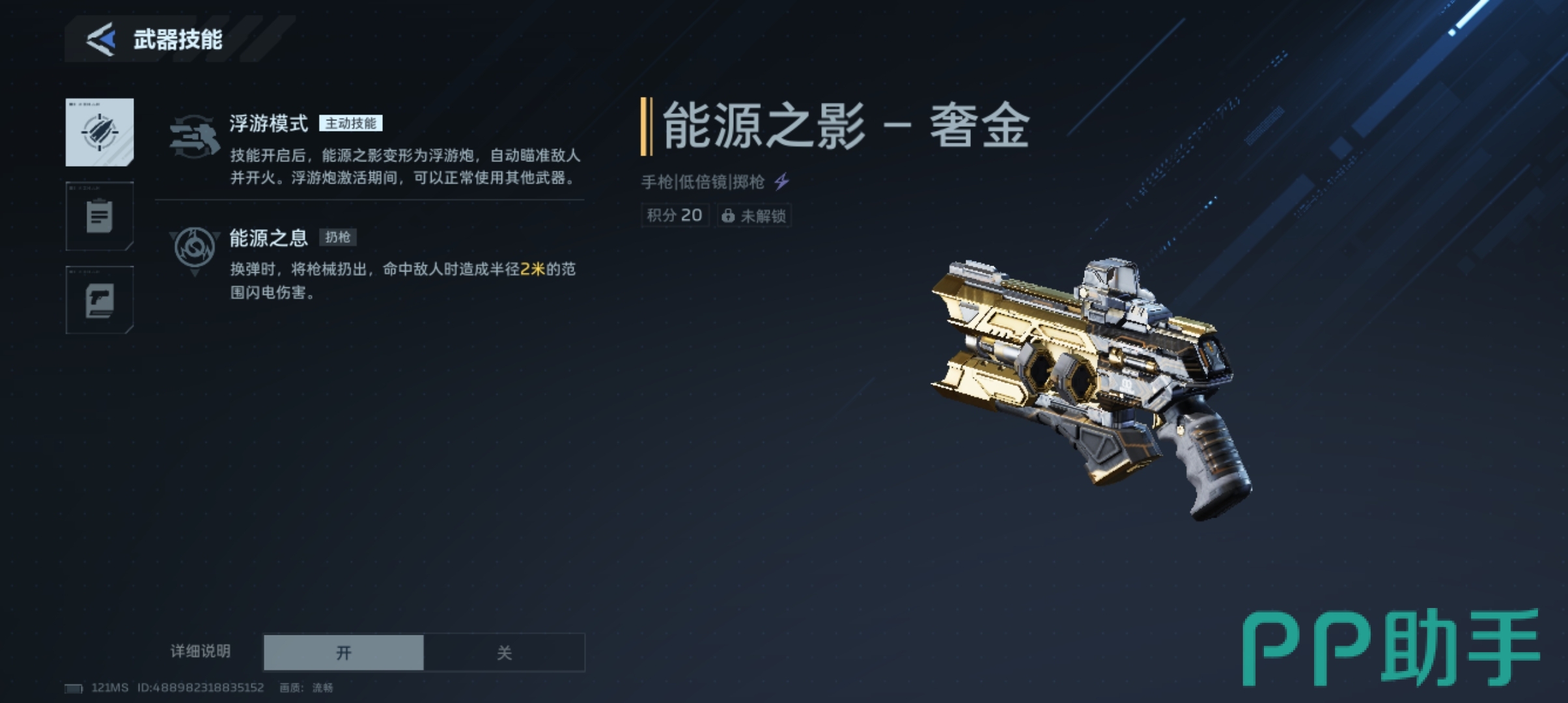 “能源之影”并非传统意义的辅助火力,而是一把融合战术智能与元素打击的复合型副武器。其主动技能可释放浮游炮进行自动索敌射击;被动技能则在换弹动作完成瞬间触发——枪体投掷命中目标后,附加闪电元素伤害。由此可知,该武器的强度高度依赖充能速率、换弹效率及元素伤害加成,配件选择必须紧密围绕这三项底层逻辑展开。