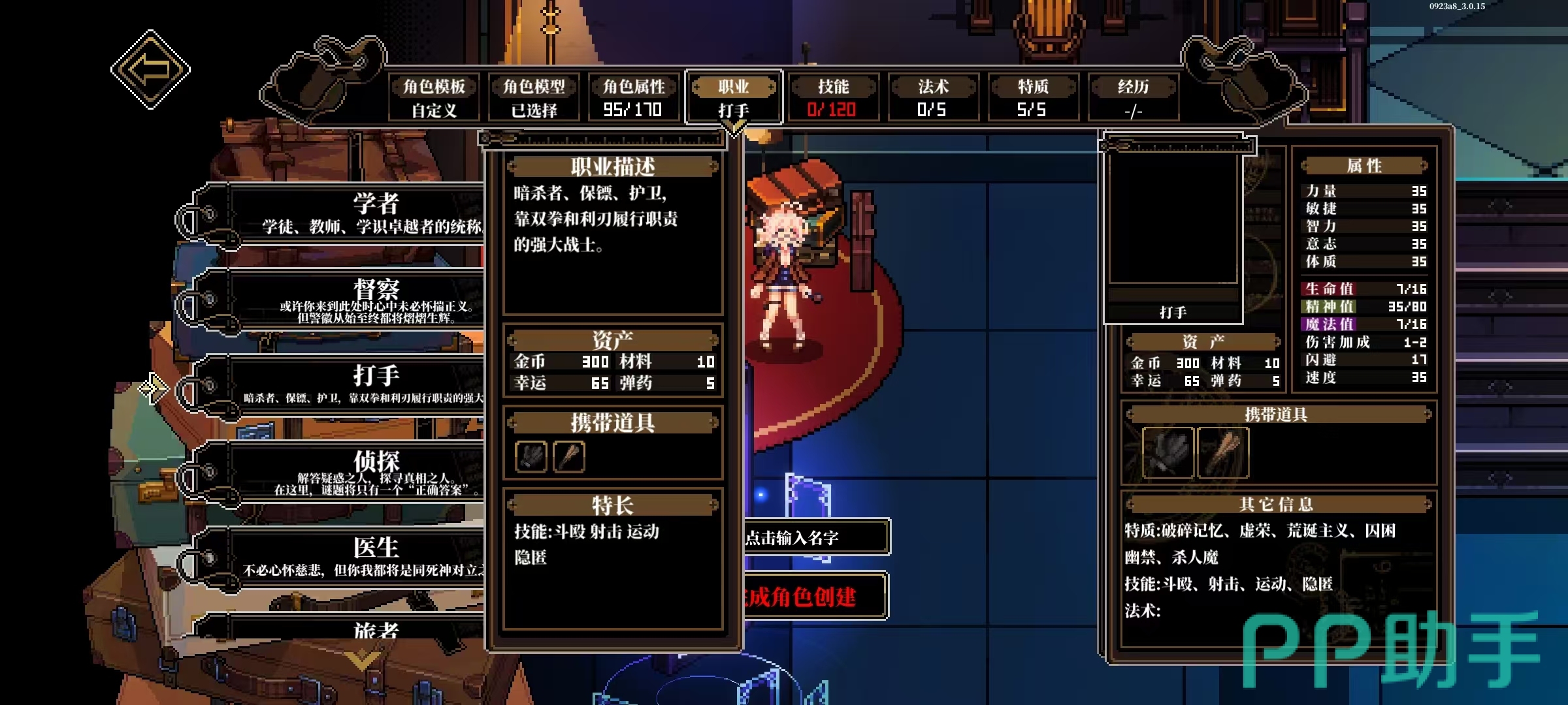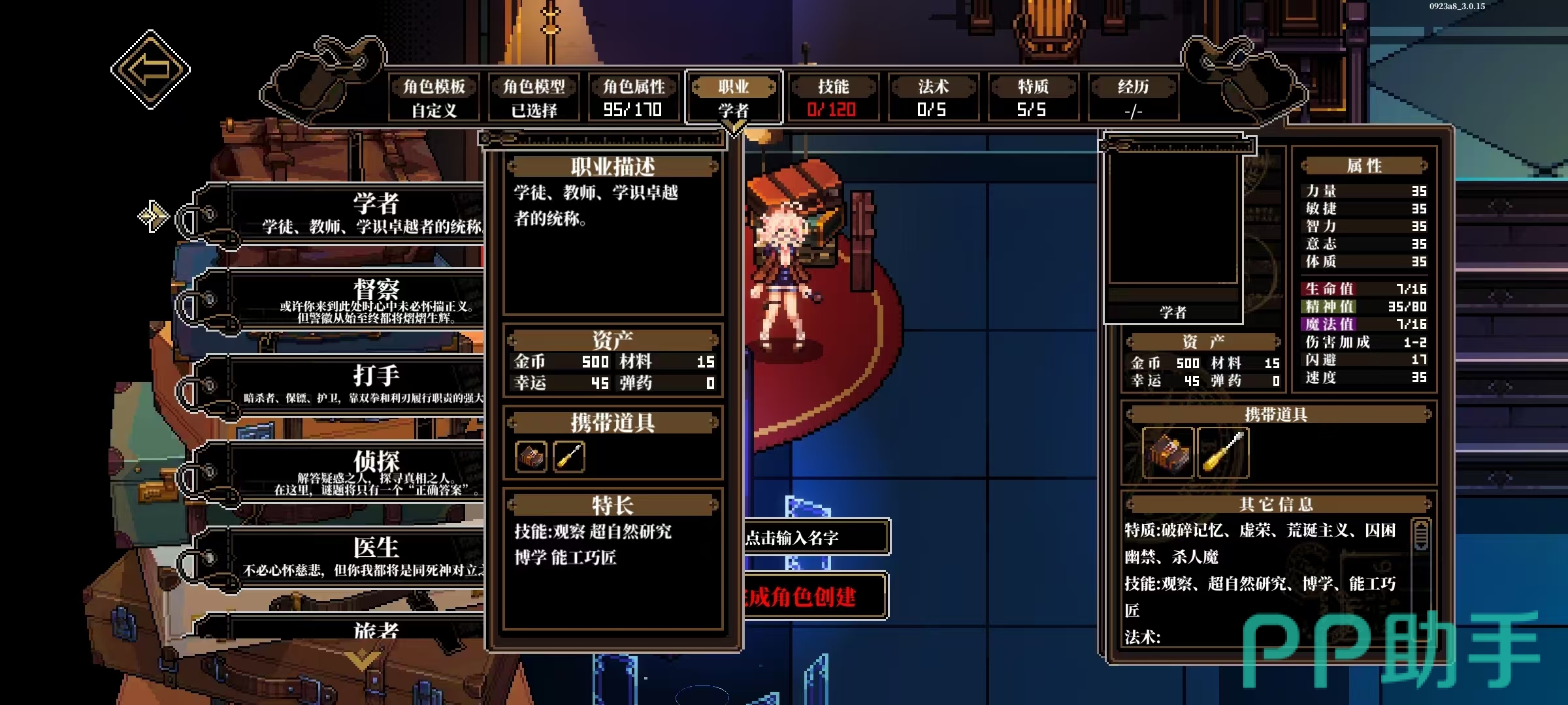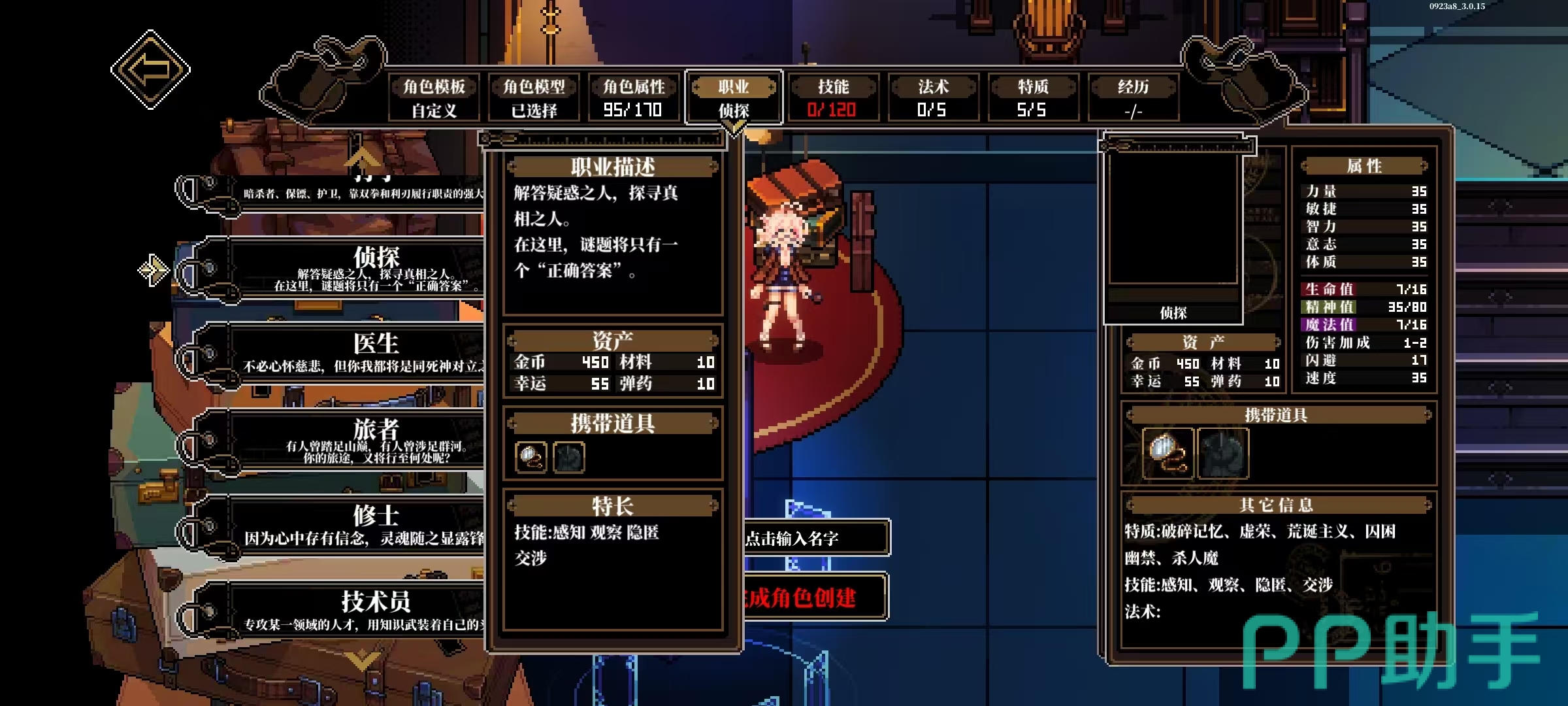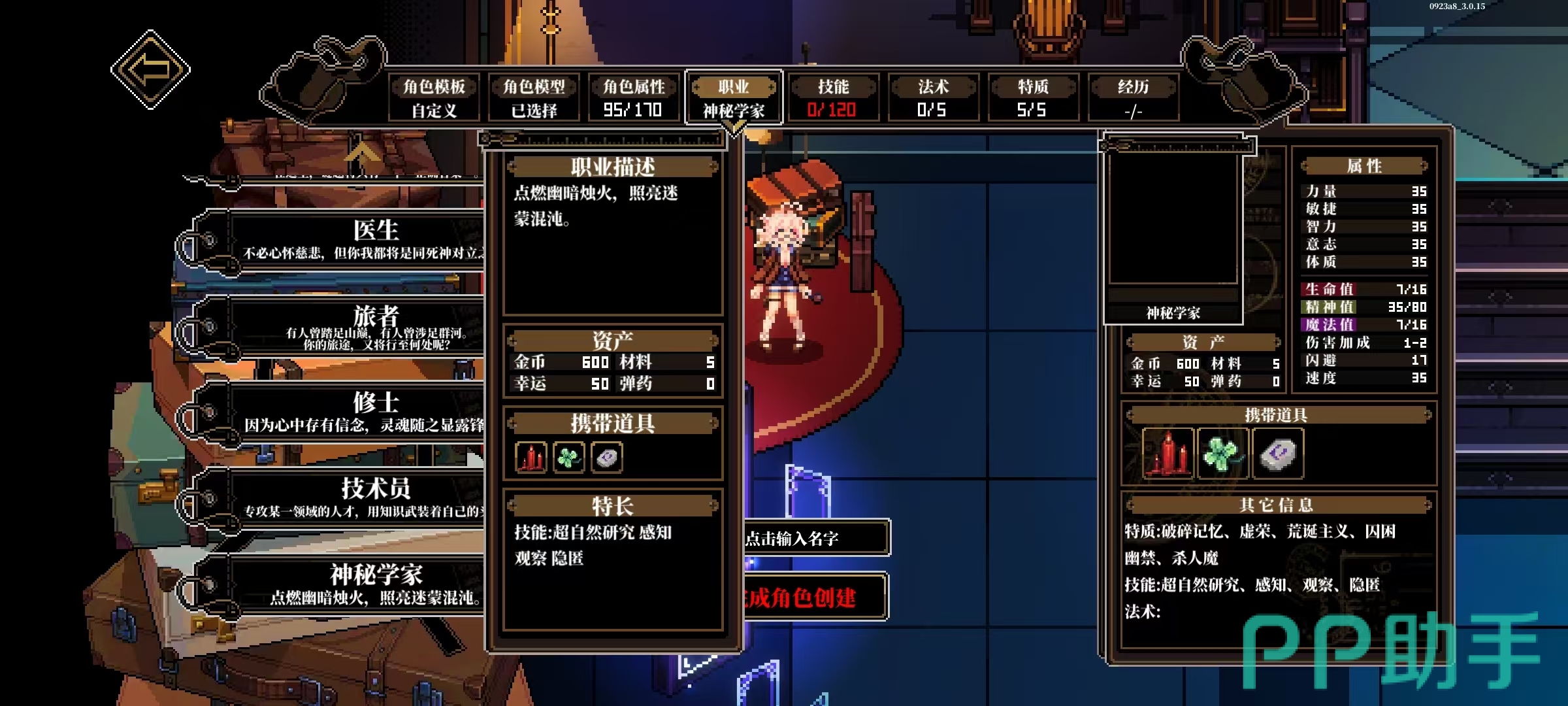 【技术员】代表机械与工程领域的专家,工具组含扳手、螺丝刀及全套维修器械,能力矩阵覆盖技术原理掌握、设备修复、动态反应与结构观察;【神秘学家】深入禁忌知识领域,仪式蜡烛(装备后不可卸除)、四叶草与魔力符文构成其专属道具体系,核心素养集中于超自然机制理解、高敏感知、微距观察及隐蔽施法。九类职业依属性侧重划分为调查向(如侦探、学者)、战斗向(如打手、督察)、辅助向(如医生、修士)及复合向(如旅者、技术员、神秘学家),并依托五维基础属性(观察、感知、交涉、运动、博学)形成差异化成长路径与流派构筑空间。