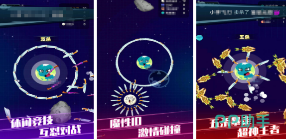本作采用高饱和度视觉设计,支持多人实时联机对战。初始角色为单一颗体,所有强化道具均需在场景中拾取。玩家通过虚拟摇杆控制移动,并配合飞刀投掷机制实现远程攻击与资源抢夺。击败体型小于自身的对手可积累积分,界面右上角实时显示当前排名与得分,增强竞技沉浸感。