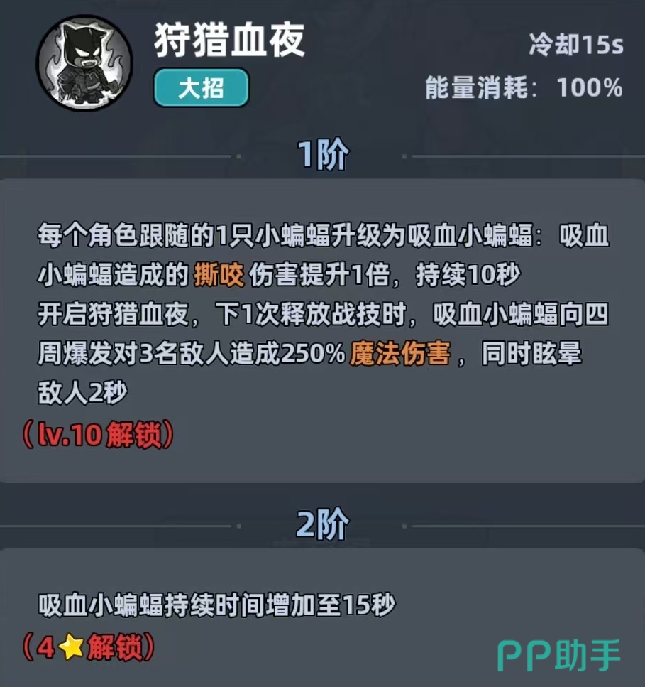 终极技能效果分两阶段:首段激活后,所有随行蝙蝠升阶为吸血蝙蝠,撕咬伤害提升;第二段触发条件为下一次任意角色释放战技时,吸血蝙蝠向周围爆发,造成范围魔法伤害并附加眩晕效果。该角色本质是高联动型辅助输出,核心功能包括为主力输出提供稳定增益、补充能量回复、提供治疗支持,并通过大招实现群体控制,尤其适配忍术大师等高频率施法的魔法主C。